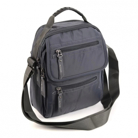 Мужская текстильная сумка. Снаружи, на лицевой стенке-клапан с кармашком на молнии и нашивной карман на молнии, с дополнительным кармашком на молнии. Сумка имеет два отделения на молниях, внутри есть боковой, открытый кармашек и на молнии. Снаружи, на задней стенке карман на молнии. Сумка имеет ручку, высотой 5 см. и не съемный регулируемый по длине наплечный ремень.