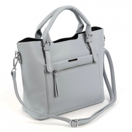 Женская, жесткая сумка из искусственной кожи серо-голубого цвета. Высота ручек 12 см. Снаружи, на лицевой стенке-карман на молнии и карман на кнопке, на задней стенке-карман на молнии. Сумка закрывается на молнию. Внутри отделение, разделенное карманом на молнии по середине и боковые кармашки, один на молнии и два открытых. На дне сумки металлические ножки. В комплекте регулируемый по длине наплечный ремень, с максимальной длиной 120 см. Вмещает формат А4.