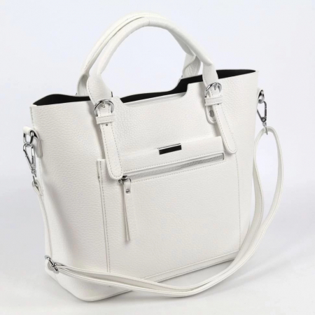 Женская, жесткая сумка из искусственной кожи белого цвета. Высота ручек 12 см. Снаружи, на лицевой стенке-карман на молнии и карман на кнопке, на задней стенке-карман на молнии. Сумка закрывается на молнию. Внутри отделение, разделенное карманом на молнии по середине и боковые кармашки, один на молнии и два открытых. На дне сумки металлические ножки. В комплекте регулируемый по длине наплечный ремень, с максимальной длиной 120 см. Вмещает формат А4.