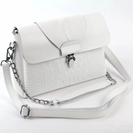 Женская сумка из натуральной гладкой кожи и кожи под крокодила белого цвета. Закрывается на клапан с рамочным замком и на молнию. Внутри три отделения и боковые кармашки, один на молнии и два открытых. Снаружи, на обратной стороне карман на молнии. В комплекте короткий ремешок с цепочкой, длиной 55 см., и регулируемый по длине наплечный ремень, с максимальной длиной 130 см.