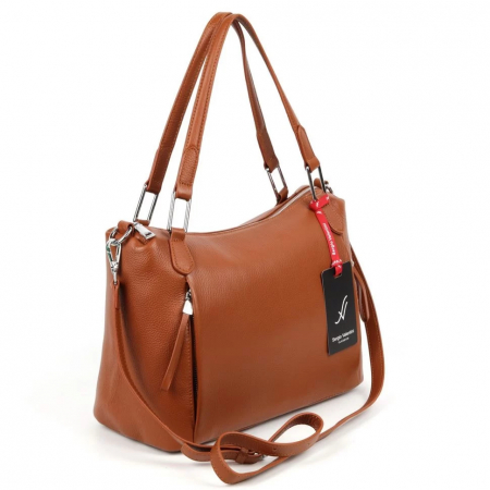Женская сумка из натуральной кожи от Sergio Valentini. Высота ручек 21 см. Сумка закрывается на молнию. Снаружи, на лицевой стенке два кармана на молниях. Внутри отделение, разделенное карманом на молнии по середине и боковые кармашки, один на молнии и один открытый. Снаружи, на задней стенке-карман на молнии. На дне сумки металлические ножки. В комплекте наплечный ремень, с максимальной длиной 110 см.