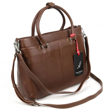 Женская сумка из натуральной кожи от Sergio Valentini. Высота ручек 12 см. Сумка закрывается на молнию. Снаружи, на лицевой стенке карман на кнопке. Внутри отделение, разделенное карманом на молнии по середине  и боковые кармашки, один на молнии и один открытый. Снаружи, на задней стенке-карман на кнопки. На дне сумки металлические ножки. В комплекте два ремешка с длиной 62 и 110 см.