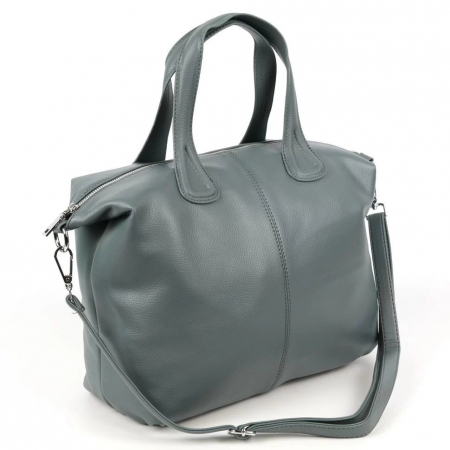 Женская бескаркасная сумка из искусственной кожи, серо-голубого цвета. Высота ручек 12 см. Сумка закрывается на молнию. Внутри отделение, разделенное карманом на молнии по середине и боковые кармашки, один на молнии и два открытых. Снаружи, на задней стенке-карман на молнии. На дне сумки металлические ножки. В комплекте наплечный ремешок, с максимальной длиной 110 см. Сумка вмещает формат А4.