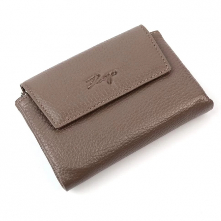 Женский кошелек из натуральной кожи от Karya темно-бежевого цвета. Закрывается на клапан с магнитными кнопками. Внутри - одно отделение для купюр, 4 боковых кармана, 6 кармашков для пластиковых карт и окошко-сетка.  Снаружи, на тыльной стороне - два кармана на молнии. Кошелек упакован в фирменную коробку.