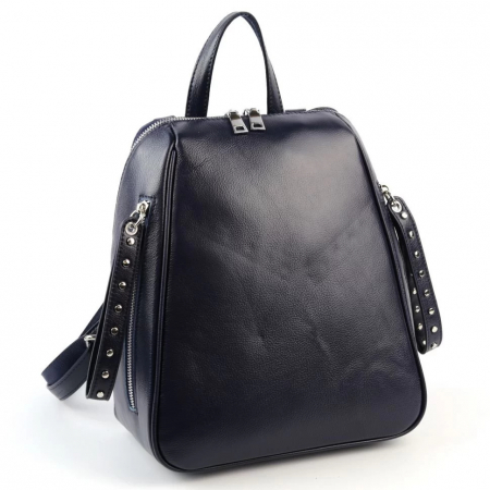 Женский рюкзак из натуральной кожи синего цвета. Снаружи два кармана на молниях с оригинальными бегунками. Рюкзак закрывается на металлическую молнию с двумя бегунками. Внутри одно отделение и боковой карман на молнии. Снаружи, на задней стенке вертикальный карман на молнии. Лямки рюкзака регулируются по длине.