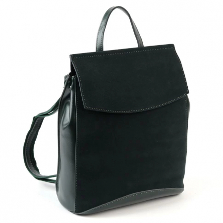 Женский рюкзак из натуральной гладкой кожи и замши темно-зеленого цвета. Лицевая сторона рюкзака выполнена из натуральной замши. Рюкзак закрывается на клапан и на молнию. Внутри одно отделение и боковые кармашки, два на молнии и три открытых. Снаружи, на задней стенке карман на молнии. Снаружи, в верхней части, по бокам есть кнопки, которые позволяют сделать рюкзак шире. Лямки рюкзака вытягиваются в длинные ручки, что позволяет носить его через плечо как сумку.