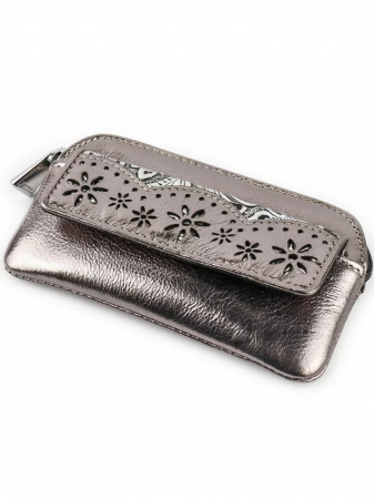 Закрывается на молнию. Внутри металлическое кольцо на цепочке. На лицевой стороне ключницы устроен карман для мелких предметов.