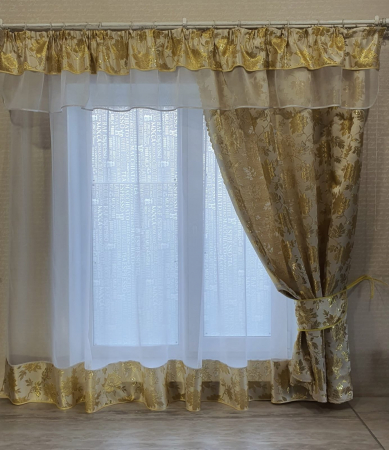 Комплект штор для кухни "Злата". Тюль р-р ширина 2,8м высота 1,8м. Ламбрекен из портьерной ткани 2,8м*0,4м. Портьера 1,4*1,8 1шт. Размеры указаны перед сборкой. Крепление: шторная лента 4см. Отделка: бейка. КОМПЛЕКТ УНИВЕРСАЛЬНЫЙ!!! МОЖНО ВЕШАТЬ ПОРТЬЕРУ КАК СПРАВА, ТАК И СЛЕВА!