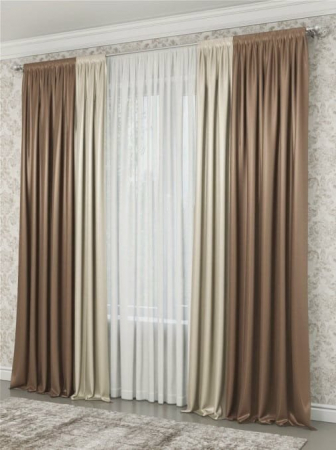 Комплект двухцветных портьер из блэкаута. В комплекте 2 полотна. Блэкаут обладает уникальными свойствами: способностью не пропускать даже самые яркие солнечные лучи, не выцветать и не менять цвет, мягко драпироваться в складки и выглядеть всегда аккуратно. В списке плюсов находится: - дополнительная звуко- и теплоизоляция помещения, связанная с высокой плотностью ткани; - использование при производстве материала особой пропитки, придающей пыле отталкивающий эффект.