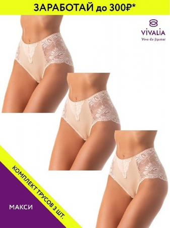 *При покупке набора трусов, ваша выгода может составлять до 100 рублей с одной единицы товара! Чем больше штук в комплекте, тем больше вы экономите! VIVALIA - качественные трусы. Классические трусы-макси из трикотажного полотна и широкого кружева с фигурным краем. Высокая линия талии. Прекрасная модель для каждой женщины. Обращаем ваше внимание, что наши изделия проходят обязательный контроль качества, и разница по ширине изделий находится в допустимых пределах согласно требованиям ГОСТ. Узор кружева, отделка и фурнитура могут отличаться от представленного на фото. Данная модель трусов представлена как в комплекте, так и по 1 шт. Просим быть внимательнее при заказе и обращать внимание на фото, цену и артикул. Артикул 24795643 поставляется в наборе из моделей разных конструкций (стринги - 1 шт; макси - 1 шт.)