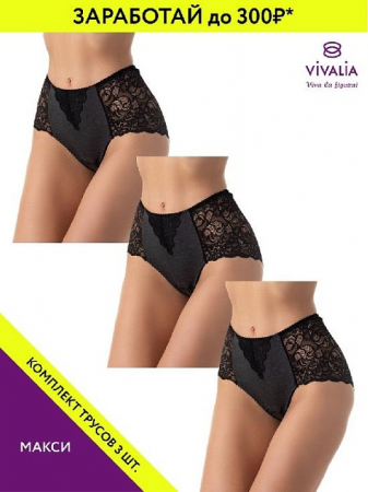 *При покупке набора трусов, ваша выгода может составлять до 100 рублей с одной единицы товара! Чем больше штук в комплекте, тем больше вы экономите! VIVALIA - качественные трусы. Классические трусы-макси из трикотажного полотна и широкого кружева с фигурным краем. Высокая линия талии. Прекрасная модель для каждой женщины. Обращаем ваше внимание, что наши изделия проходят обязательный контроль качества, и разница по ширине изделий находится в допустимых пределах согласно требованиям ГОСТ. Узор кружева, отделка и фурнитура могут отличаться от представленного на фото. Данная модель трусов представлена как в комплекте, так и по 1 шт. Просим быть внимательнее при заказе и обращать внимание на фото, цену и артикул. Артикул 24795643 поставляется в наборе из моделей разных конструкций (стринги - 1 шт; макси - 1 шт.)