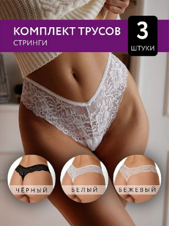 VIVALIA - качественные трусы. Кружевные трусы женские конструкции "стринги" - очаровательная женственная модель, идеальный выбор на каждый день и для особого случая. Мягкое кружево незаметно прилегает к телу, сглаживая силуэт. Двойная ластовица с внутренним слоем из натурального хлопка. Отделка и фурнитура могут отличаться от представленных на фото. Нас ищут по запросам: стринги женские, трусы женские стринги, стринги женские набор, стринги женские кружевные, трусы стринги женские, нижнее белье женские трусы.