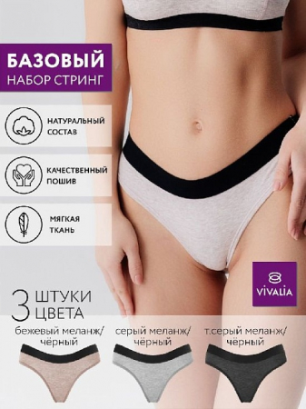 VIVALIA - качественные трусы. Трусы стринги женские с заниженной линией талии - модель, комфортная как для повседневной носки, так и для занятий спортом. Широкая резинка идеально прилегает к телу. Оригинальный дизайн в спортивном стиле. Трусики выполнены из приятного к телу хлопкового полотна. Отделка и фурнитура могут отличаться от представленных на фото.