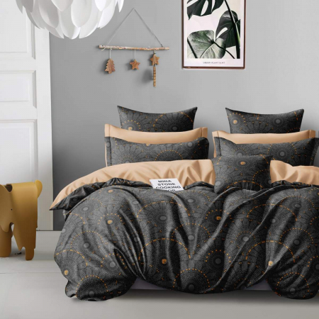 Пододеяльник двухсторонний, простыня выполнена из ткани-компаньона, наволочки выполнены из ткани-основы.