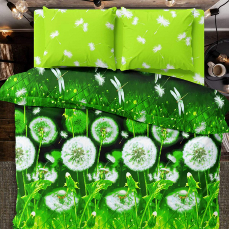 Комплект постельного белья «Одуванчики» выполнен из бязи (100% хлопок). Белые воздушные одуванчики на сочном зеленом фоне создадут летнюю атмосферу в спальне.
