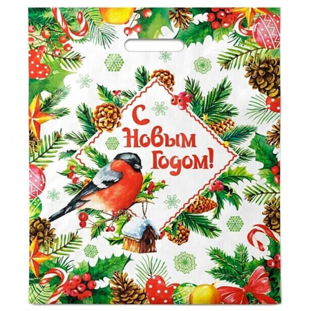 Пакет подарочный ПВД с вырубной ручкой 40х47см "Снегирь", 45 мкм (Россия) (арт. 065397)