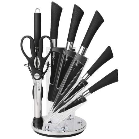 Набор ножей, 9пр: нож-топорик -1,5mm/6,5'', поварской нож - 1,5mm/8", нож разделочный -1,5mm/8", универсальный нож - 1,2mm/5", нож для овощей – 1,2mm/3,5, мусат, ножницы, овощечистка, лезвие - сталь, прорез/ручки, скл/подставка подар/упаковка с пл/руч