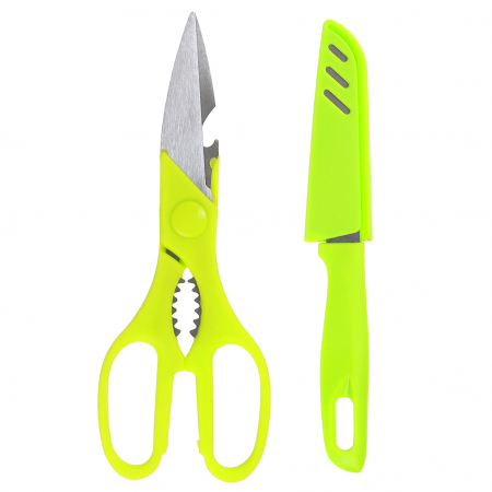 Кухонный набор 2 предмета: нож для овощей 90мм с чехлом; ножницы кухонные 20,5х7,5х1,3см, с открывашкой, с орехоколом; нерж/пластик, цвета микс, в блистере (Китай) (арт. 059075)