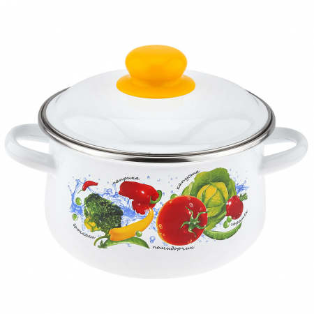 "Овощной фреш" Кастрюля эмалированная 2л, д17см, h12,5см, коническая форма, металлическая крышка, ободок из нержавеющей стали, белый (Россия) (арт. 107050)