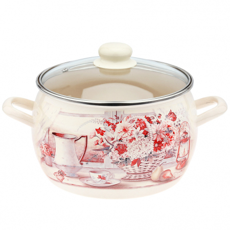 "Летний этюд" Кастрюля эмалированная 5,0л, форма полусфера, стеклянная крышка, нержавеющий ободок (Россия) (арт. 008624)