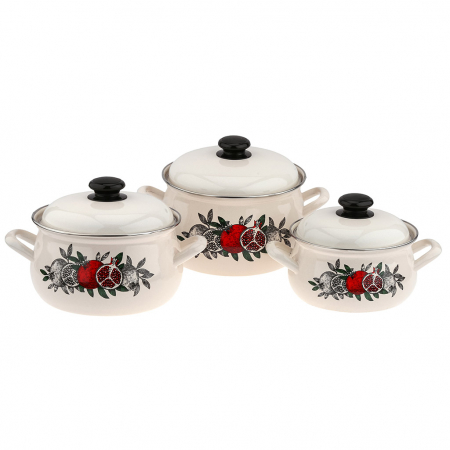 "Цвет граната" Набор эмалированных кастрюль 3 предмета: 2л - д18,5см, h9,8см, 3л - д21см, h12см, 4,5л - д23,5см, h13,2см, s0,8мм, форма грушевидная, двойной слой эмалевого покрытия, металлическая крышка (Россия) (арт. 002864)