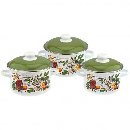 "Вкусный компот" Набор эмалированных кастрюль 3 предмета: 2л, 3л, 4л, цилиндрическая форма, металлическая крышка, белый (Россия) (арт. 101296)
