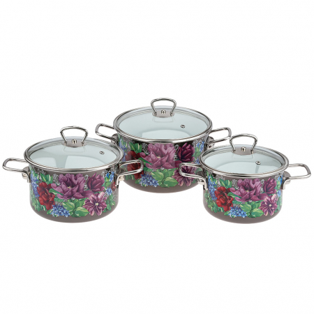 "Catalina" Набор эмалированных кастрюль 3 предмета: 2л, 3л, 4л, цилиндрическая форма, стеклянная крышка, белый/мокрый асфальт (Россия) (арт. 101295)