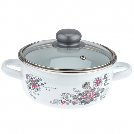 Кастрюля эмалированная "Весенний романс" 1,5л, д18см, h8,5см, сферическая форма, стеклянная крышка, белый (Россия) (арт. 101216)