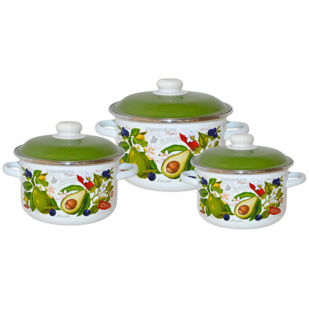 "Авокадо" Набор эмалированных кастрюль 3 предмета: 2л, 3л, 5,5л, цилиндрическая форма, металлическая крышка, белый (Россия) (арт. 057239)