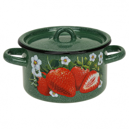 "Клубника садовая" Кастрюля эмалированная 1,5л, д15см, h9см, цилиндрическая форма, металлическая крышка, изумрудный рябчик (Россия) (арт. 057411)