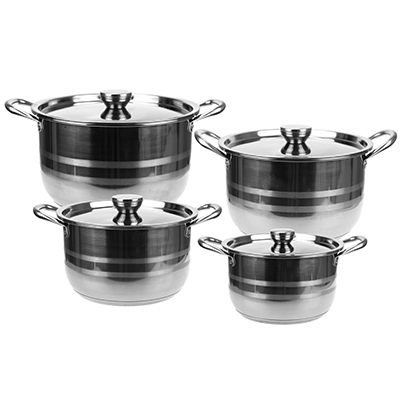"Кухня" Набор кастрюль из нержавеющей стали 4 штуки: 24х14см 4,7л; 26х15см 6,2л; 28х16,5см 8л; 30х17,5см 10л, крышки и ручки нержавеющая сталь, с теплораспределительным дном 1см, цветная коробка (Китай) (арт. 096304)
