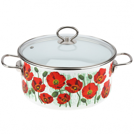 "Maki" Кастрюля эмалированная 5л, д26см, h20см, цилиндрическая форма, стеклянная крышка, белый (Россия) (арт. 067463)