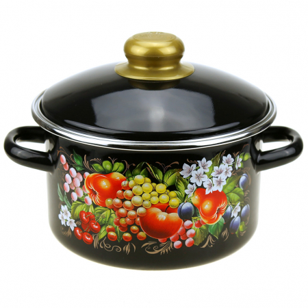 "Жостово" Кастрюля эмалированная 2л, цилиндрическая форма, металлическая крышка с деколью с пластмассовой ручкой-кнопкой, ободок из нержавеющей стали, круговая деколь, черный (Россия) (арт. 040218)
