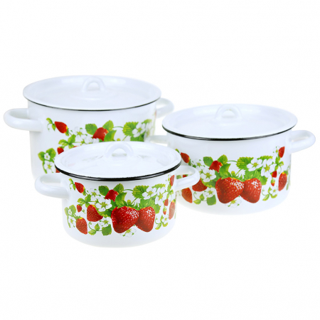 "Клубничная поляна" Набор эмалированных кастрюль 3 предмета: 1,5л, д16см, h10см, 2,9л, д20см, h13см, 4,5л, д22см, h14см, цилиндрическая форма, металлическая крышка, белый (Россия) (арт. 035947)