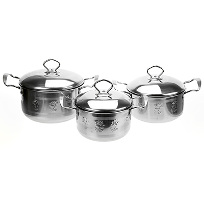 "Розы" Набор кастрюль из нержавеющей стали 3 штуки: 17х9,7см 1,9л; 19,3х9,7см 2,4л; 21х11,5см 3,6л, крышки и ручки нержавеющая сталь, без теплораспределительного дна, цветная коробка (Китай) (арт. 092360)