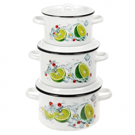 "Мохито" Набор эмалированных кастрюль 3 предмета: 1,5л, д16см, h10см, 2,9л, д20см, h13см, 4,5л, д22см, h14см, цилиндрическая форма, металлическая крышка, белый (Россия) (арт. 001041)