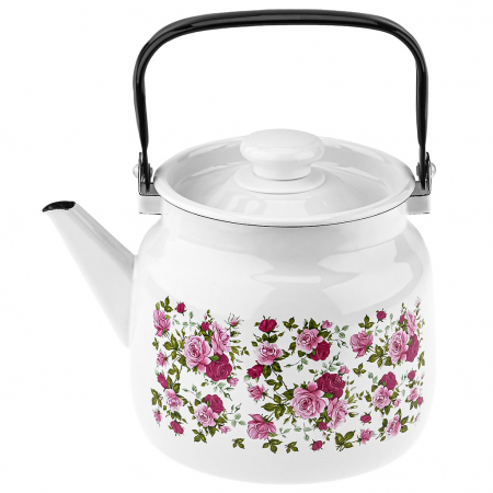 "Китайская роза" Чайник эмалированный 3,5л, 3,5л, д19,4см, h16,2см, s0,08мм, двойной слой эмалевого покрытия, металлическая крышка с пластмассовой ручкой-кнопкой, металлическая подвижная ручка (Россия) (арт. 105976)