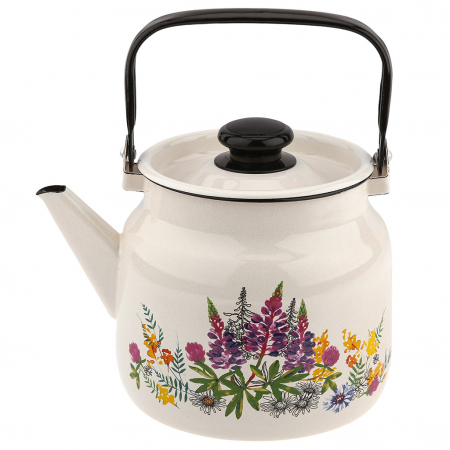 "Люпины" Чайник эмалированный 3,5л, 3,5л, д19,4см, h16,2см, s0,08мм, двойной слой эмалевого покрытия, металлическая крышка с пластмассовой ручкой-кнопкой, металлическая подвижная ручка (Россия) (арт. 104471)