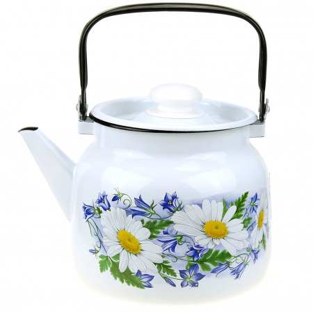 "Ромашковое поле" Чайник эмалированный 3,5л, д19,4см, h16,2см, s0,08мм, двойной слой эмалевого покрытия, металлическая крышка с пластмассовой ручкой-кнопкой, металлическая подвижная ручка (Россия) (арт. 042181)