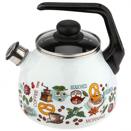"Утренний кофе" Чайник эмалированный 3л, д20см, h16см, со свистком, сферическая форма, стеклянная крышка, белый (Россия) (арт. 101315)