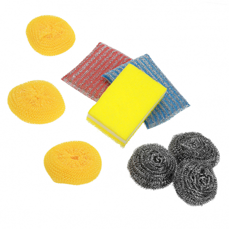 Губка для посуды, 9 штук: поролон с абразивом 10,5х6,5х3см; поролон/ПВХ металлизированная 11,5х8х1,8см; металлическая д6,5см - 3 штуки, пластик д8см - 3 штуки, в п/эт упаковке (Китай) (арт. 046046)