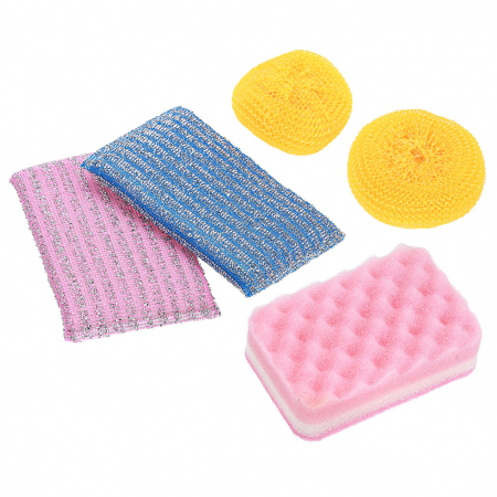 Губка для посуды, 5 штук: поролон с абразивом 9,5х6,5х3,3см; поролон/ПВХ металлизированная 13х8,5х1,5см - 2 штуки; пластик д8см - 2 штуки, в п/эт упаковке (Китай) (арт. 046049)