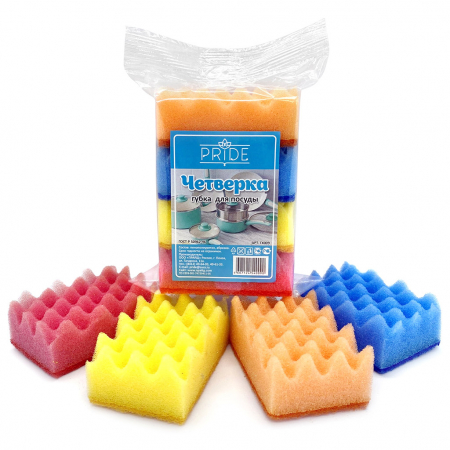 Губка для посуды "Четверка" 9х6х3,5см, пенополиуретан, морская пена, абразивное полотно, плотность 450г/м2, набор 4шт (Россия) (арт. 066087)