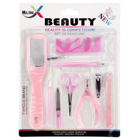 Педикюрный набор 14пр книпсер 5,3см/пилка мет 8,7см/терка д/ног 19,5см/пилка двухстор 11,5см наждачная-5шт/триммер 10,8см/пушер для кутикулы 10см/ножницы 9см/щипчики 10,5см/пинцет 8,5см/разделитель для пальцев 9,5см розовый/голубой в/бл (ДМ)