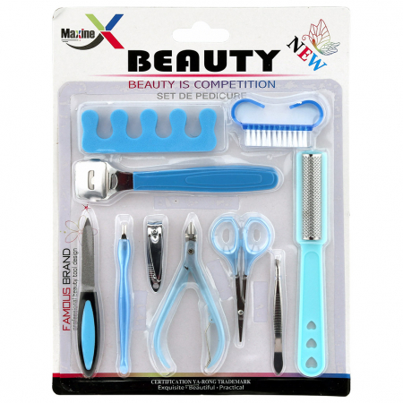 Педикюрный набор 10пр книпсер 5,3см/пилка мет 11,5см/терка д/ног 16,3см/станок с лезвием 14,4см/триммер 10,8см/ножницы 9см/щипчики 10,5см/пинцет 8,5см/щетка 6,5см/разделитель для пальцев 9,5см розовый/голубой в/бл (ДМ)