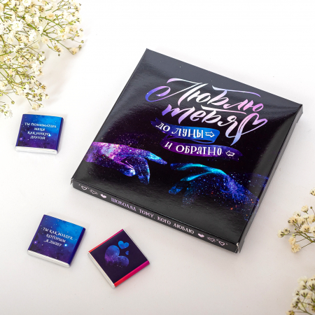Внутри 9 шоколадок (вес каждой шоколадки: 5 гр., размер: 31 х 31 мм.)
