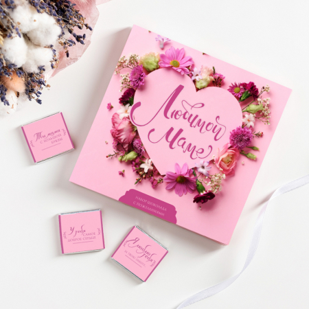Каждая шоколадка упакована в индивидуальную этикетку с пожеланием.