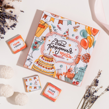 Каждая шоколадка упакована в индивидуальную этикетку с пожеланием.
