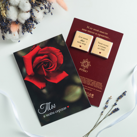 Внутри открытки - 2 шоколадки (вес каждой шоколадки: 5 гр., размер: 31 х 31 мм.)