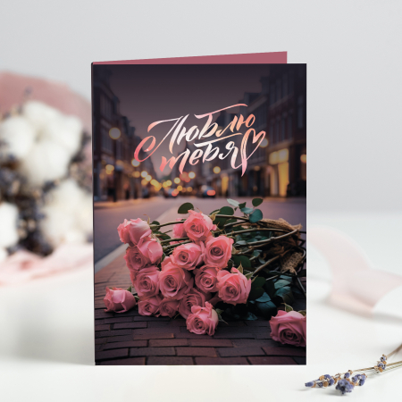 Открытка 4 шоколадки "Люблю тебя" (розы на фоне города) (арт. О4349)